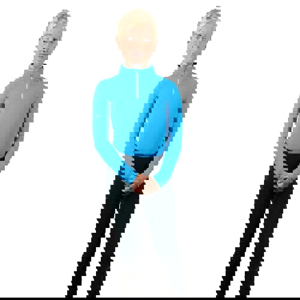 Coldstream Kids Next Generation Ecclaw Elite base layer top in blue with 4 way stretch fabric and a high neck with quarter zip. The design includes a back print, sleeve print and a silicone logo. Long sleeves and hexagonal detailing complete the look, including hexagonal perforation and a hexagonal zip pull.