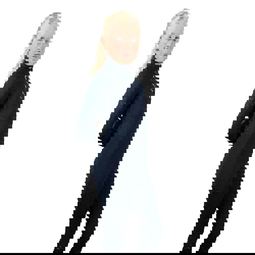 This kids’ base layer top comes in navy and combines a logo detail with sleeve print. It has long sleeves and a quarter zip neckline with a standing collar. A contrast zip pull with a hexagonal zip pull completes the front fastening.