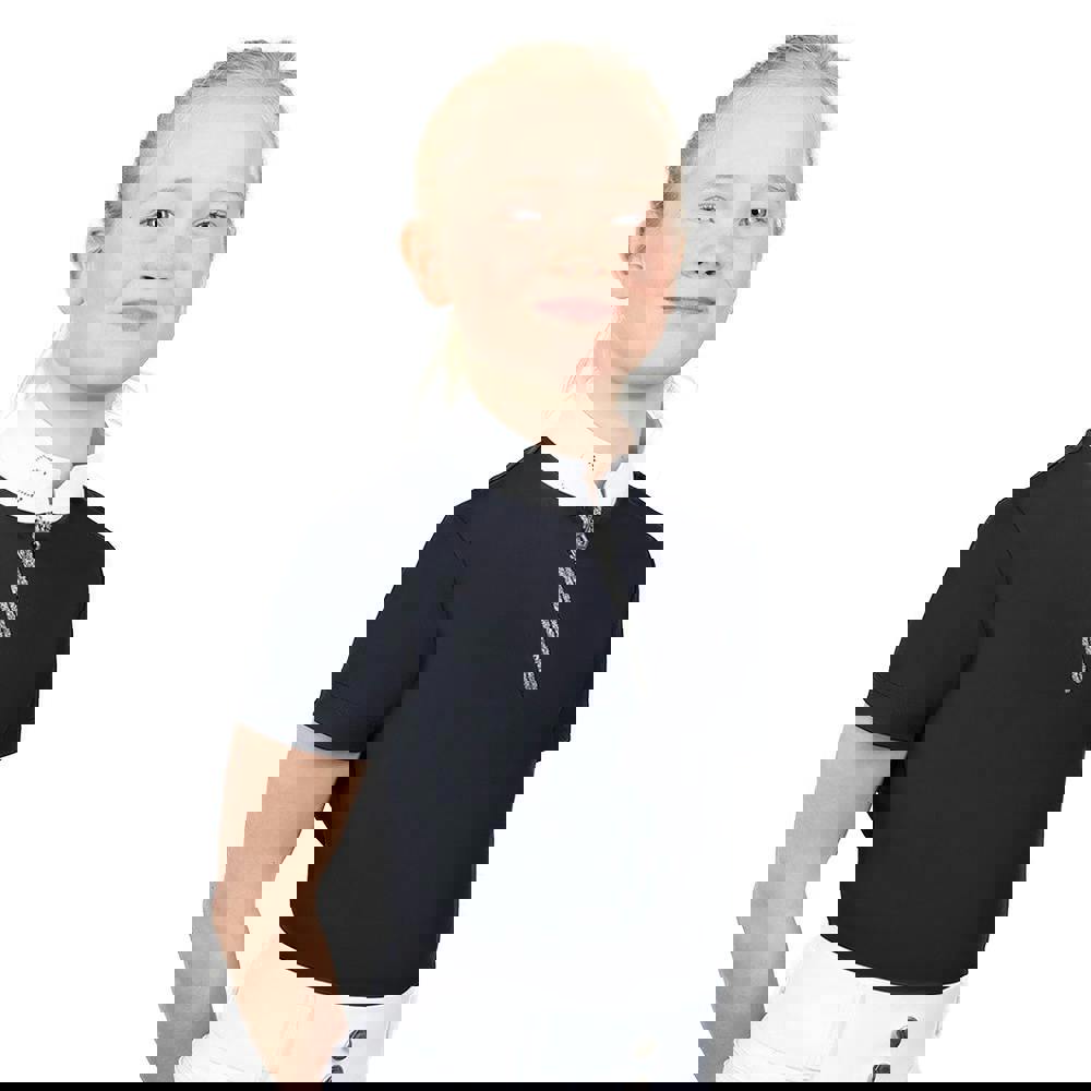 The Coldstream Kids Next Generation Elrick Show Shirt in navy is designed with a collared neckline and short sleeves for a smart, show-ready look. Finished with diamante detailing and a logo design, it brings a polished feel while keeping the style suitable for younger riders.