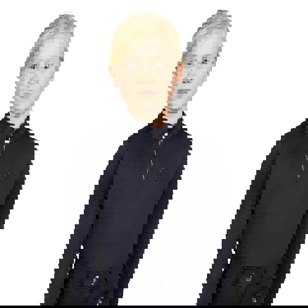 This kids’ base layer top comes in black with a logo and sparkle design. It has long sleeves and a standing collar. Fabric technology includes breathable, lightweight and moisture wicking properties.