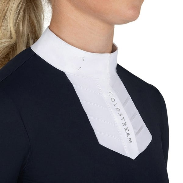 The Coldstream Kids Next Generation Roslin Crystal Ruffles Show Shirt in navy is designed with a standing collar and short sleeves for a smart, structured look. Finished with ruffled detailing and contrast accents, it brings a polished feel to show-day dressing while keeping the overall style clean and contemporary.