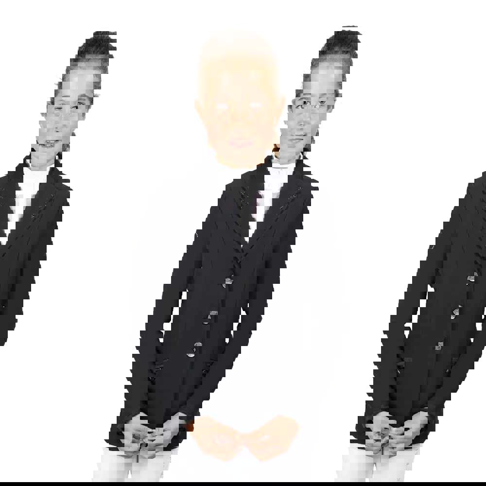 The Coldstream Kids Suede Horse Riding Jacket in black is designed for horse riding, with a printed finish and perforated detailing for added interest. A lapel neckline and long sleeves create a smart, structured look, while a button fastening keeps the style neat and secure.
