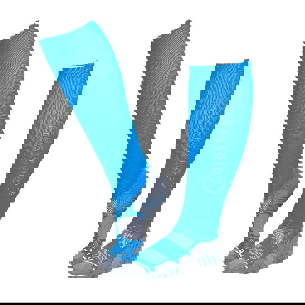 Coldstream Morriston performance boot socks come in blue with a logo design. Built for unisex adult wear, they include mesh panels and ventilated sections for added airflow, alongside moisture control and breathable Coolmax fabric technology.