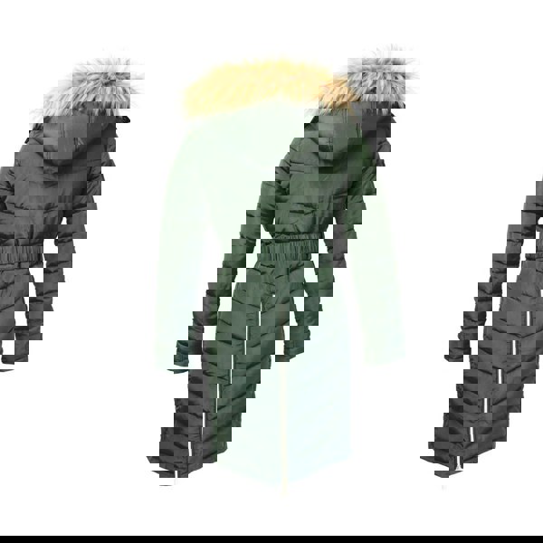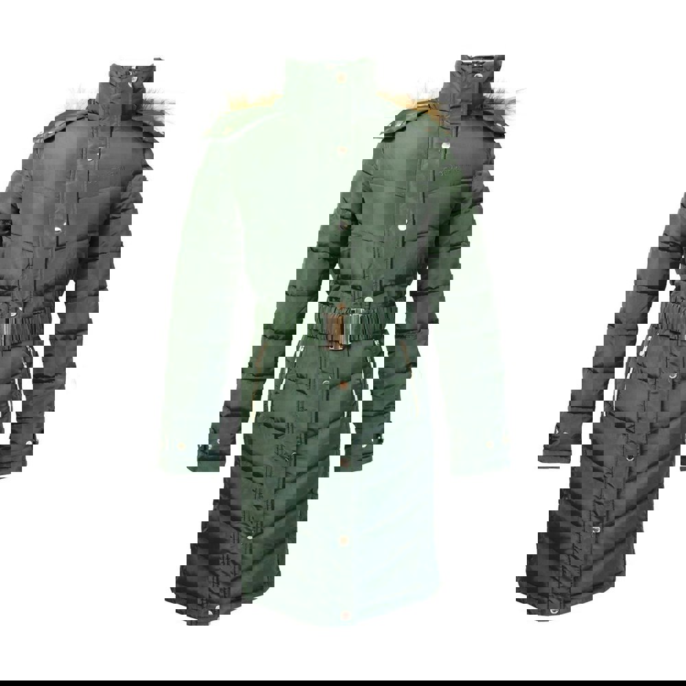 This long women’s quilted coat is finished with logo detailing and quilted panels for a structured look. A grown-on hood adds coverage, with a detachable faux fur trim for a change in finish. The standing collar fastens with buttons, while the front closes with a two-way zip and contrast buttons.