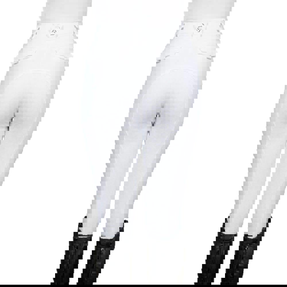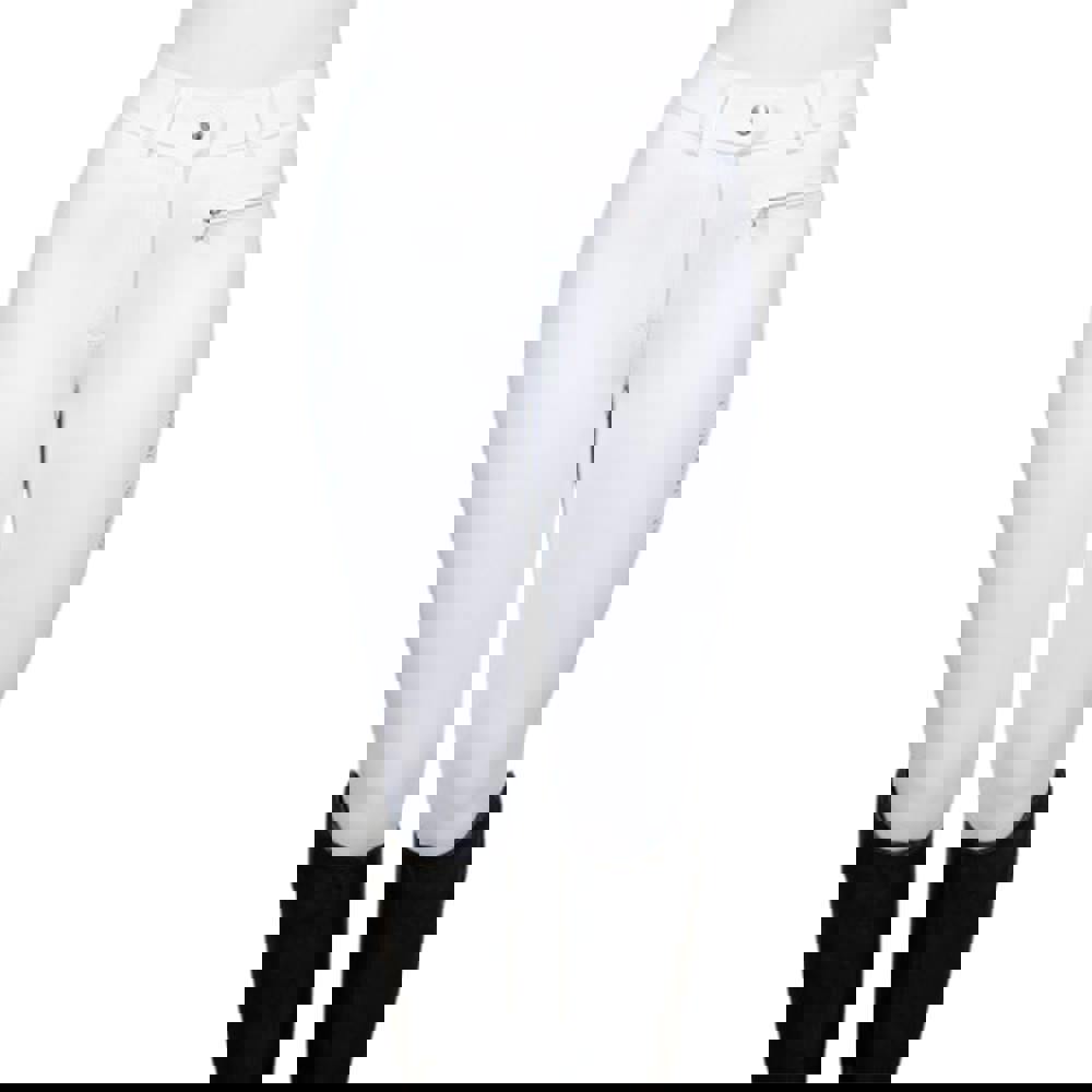 The Coldstream Womens Carham Sparkle Breeches in white are designed with a stretch finish and a structured shape. Featuring a mix of plain and patterned detailing, they are finished with logo and stitch accents, plus diamante embellishments for a subtle sparkle.