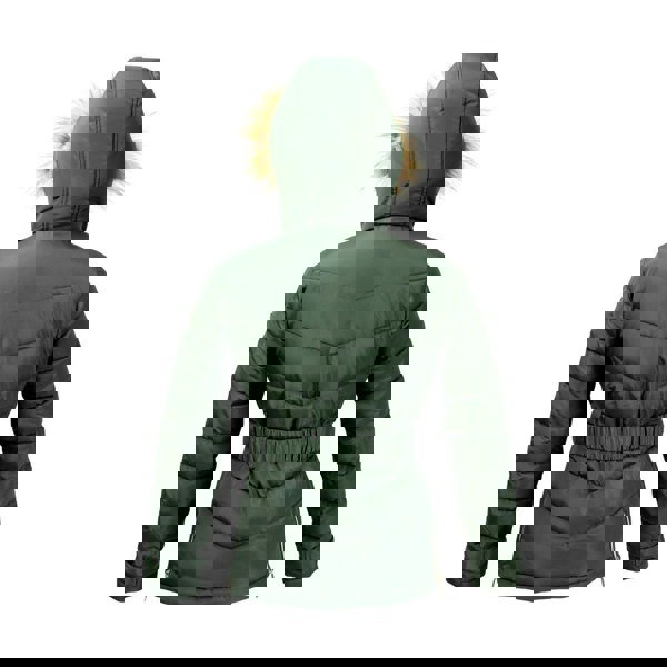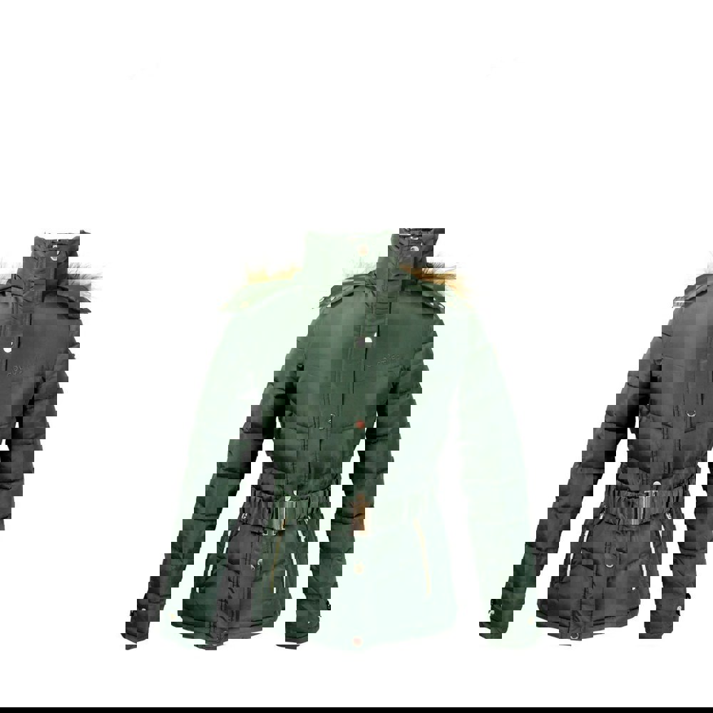 A grown-on hood adds coverage, with a detachable faux fur trim for a changeable finish. The elasticated waistband and belt provide adjustable shaping, while ventilation zips and side vents offer practical movement. Fasten with a two way zip and contrast buttons, and keep essentials close in the two side entry pockets.