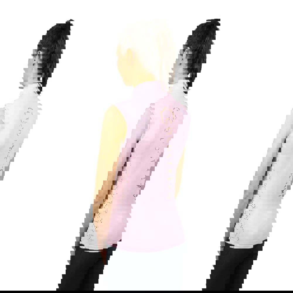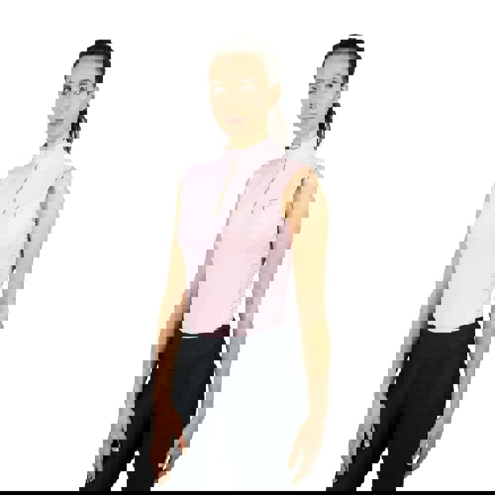 This sleeveless base layer top comes in blush pink with a tailored fit and a standing collar. A zip neckline allows adjustable coverage, while mesh panels and perforated airflow add detail to the construction. The fabric has a soft-touch finish with 4-way stretch.