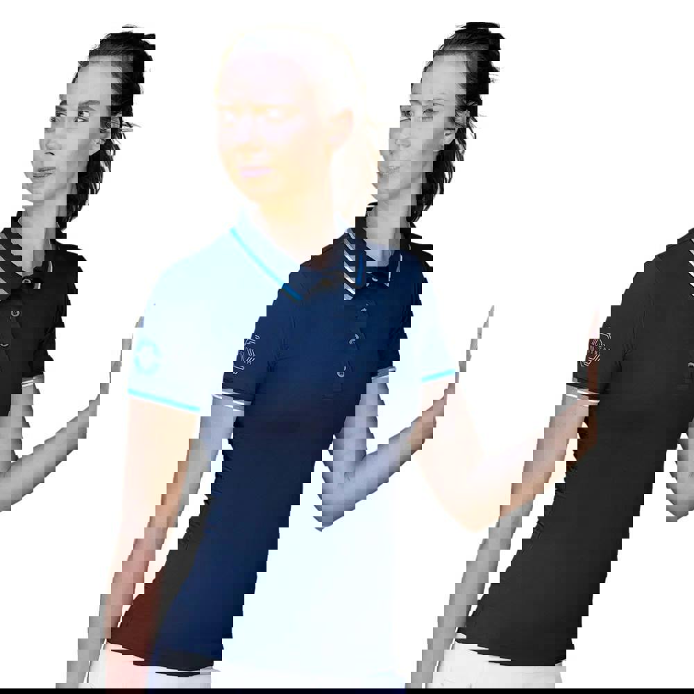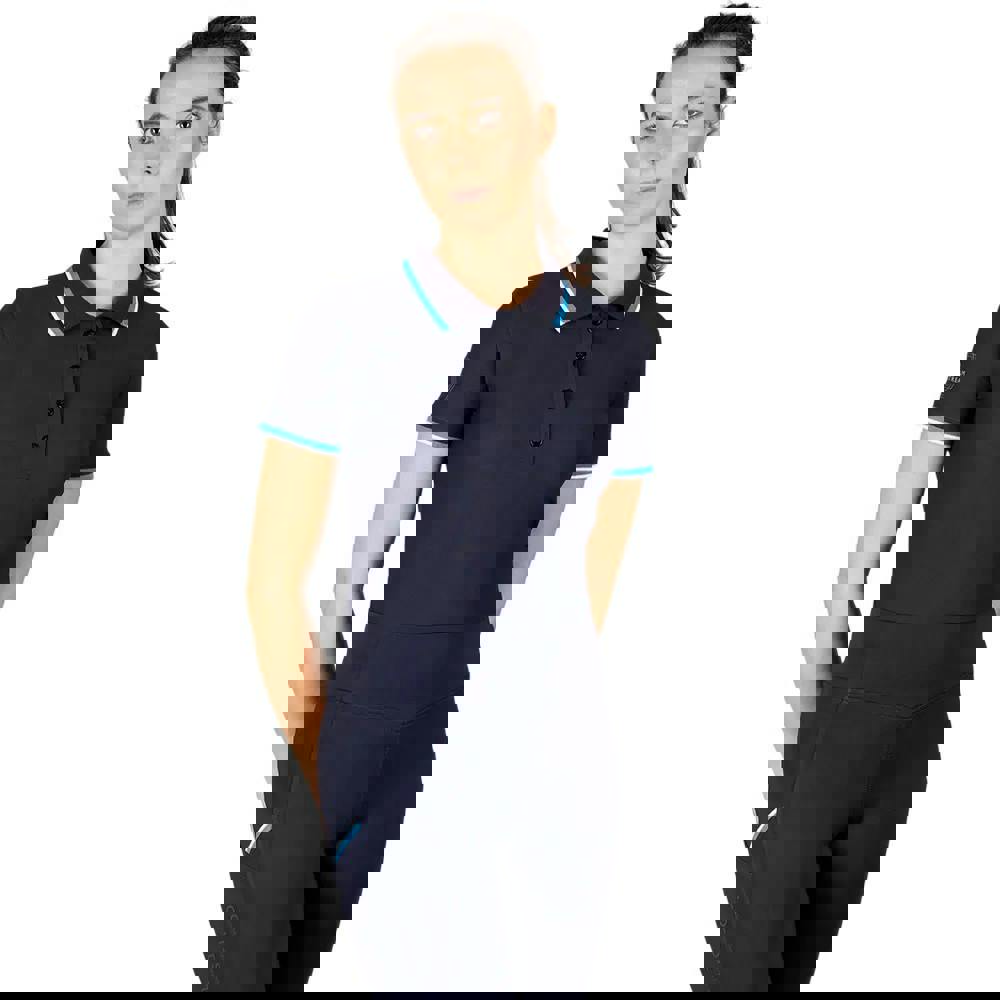 The Coldstream Womens Darnick Polo Shirt in navy combines a plain base with contrast detailing and logo branding. It has a ribbed, turn-down collar and short sleeves, finished with contrast-edge cuffs. A button fastening sits at the neckline, with a pull-over style for easy wear.