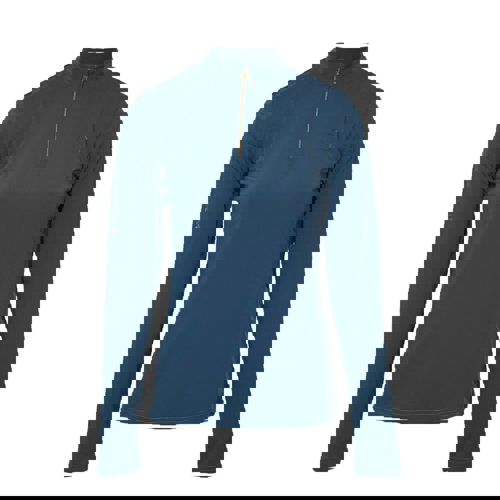 Coldstream Ednam base layer top in slate blue with a tonal logo and long sleeves. The soft-touch, 4 way stretch fabric is paired with mesh side panels and a standing collar. A quarter zip pull over fastening completes the streamlined look, with a tailored fit for a neat, close profile.