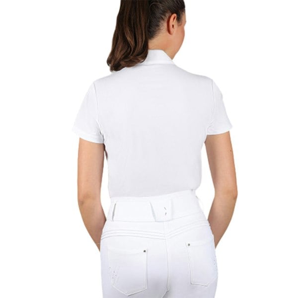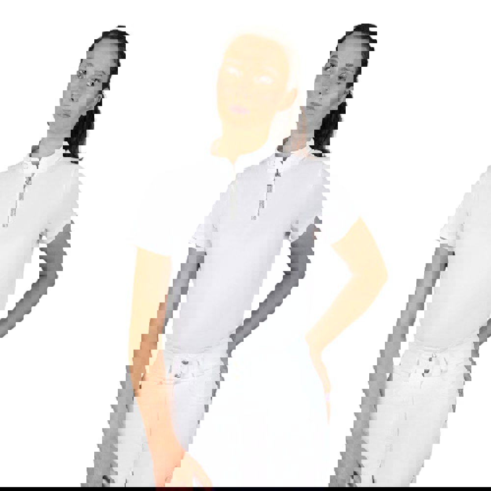 Finished with a plain design alongside logo and diamante detailing, this show shirt balances a classic appearance with subtle decorative touches. The soft-touch, stretch fabric is supported by breathable, moisture-wicking technology, and it is made from recycled materials. A UPF 50+ sun rating is also specified.