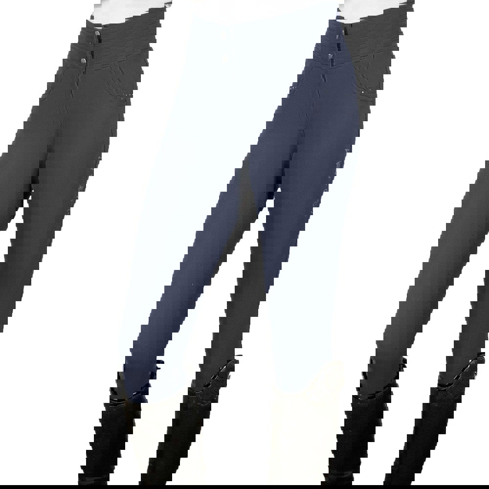 The Coldstream Womens Fenham Diamante Breeches in navy are designed to bring a polished look to your riding wardrobe, with diamante detailing and logo design elements. Created with 4 way stretch fabric technology, they offer breathable comfort for everyday wear.