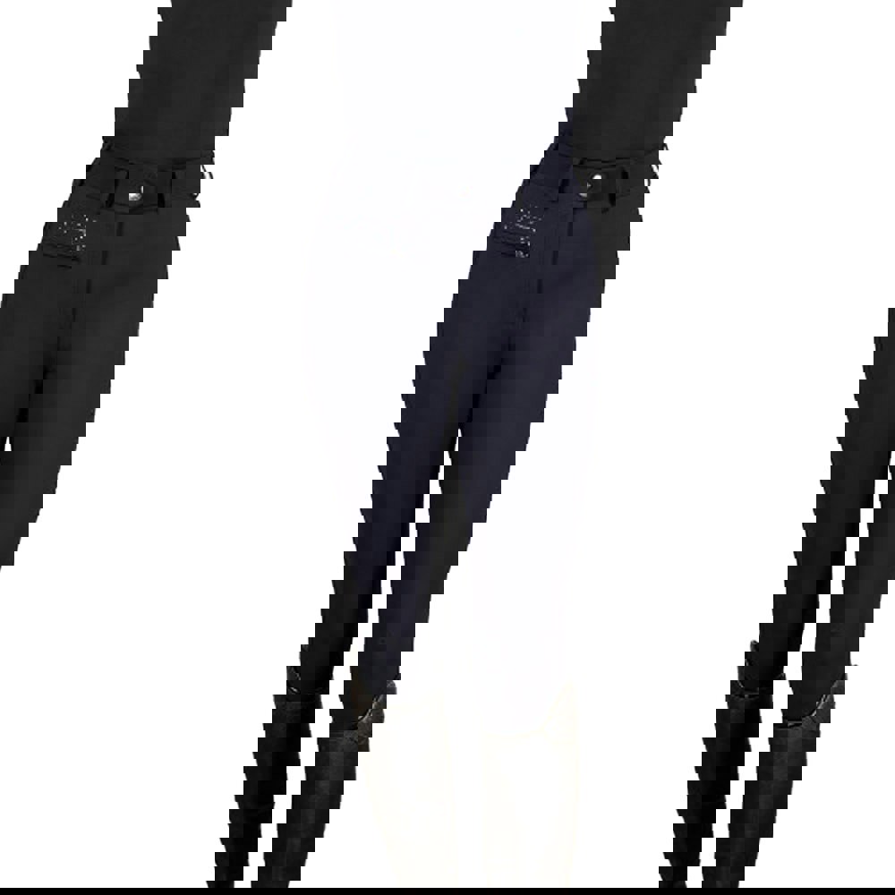 The Coldstream Womens Hamilton Sparkle Breeches in navy are designed with a technical 4 way stretch fabric for a flexible feel. A high-rise, elasticated waistline helps provide a secure fit, while an inner silicone layer with silicone grip adds extra hold where needed.