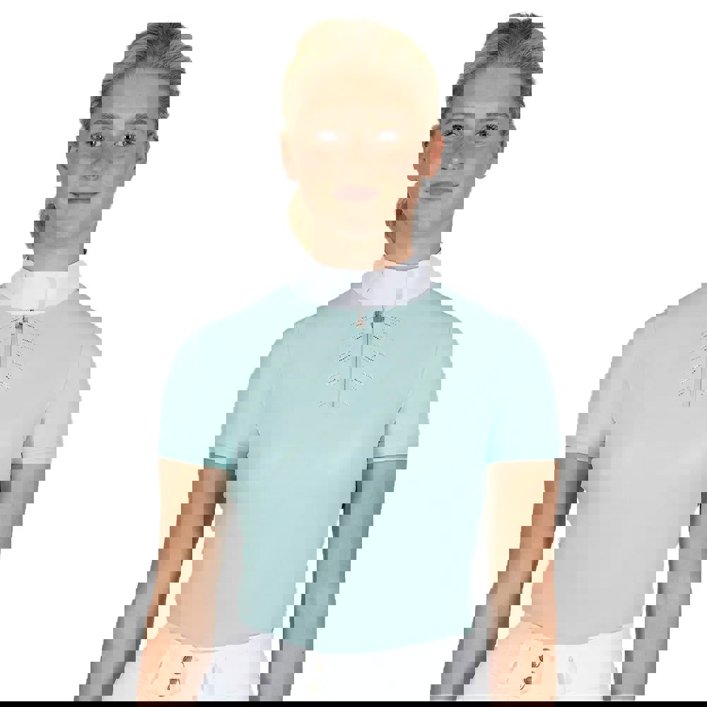 The Coldstream Womens Harthill Diamante Show Shirt in Glacier Boulevard is designed with a high collar and a clean tonal look, finished with diamante detailing for a refined appearance. With a plain design and short sleeves, it offers a neat, streamlined style that suits a smart show-ready outfit.
