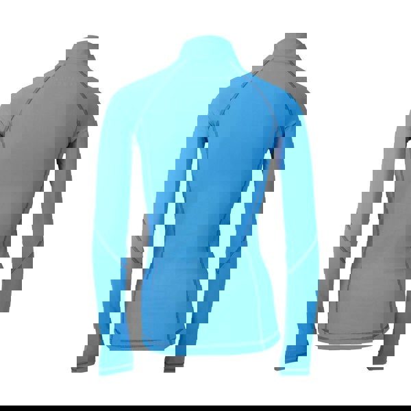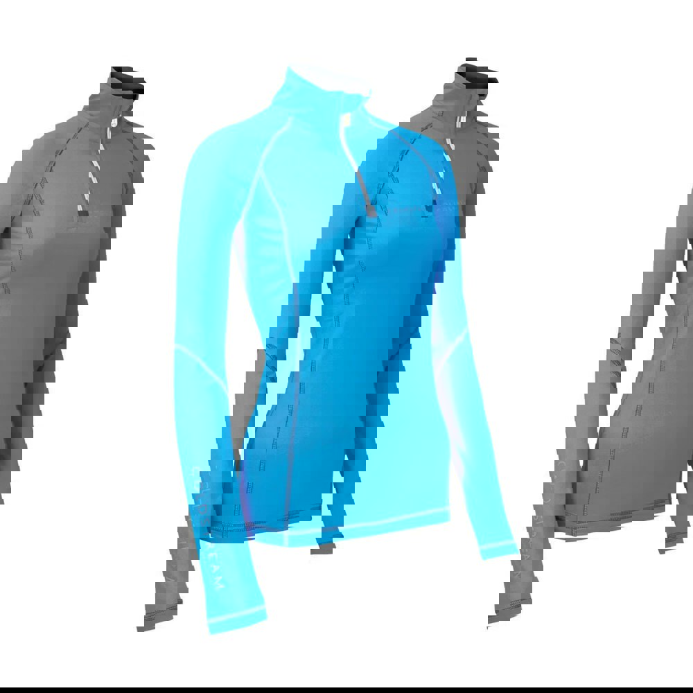 The Coldstream Lennel top comes in a blue and grey colourway with a logo design. It is long-sleeved and cut to a tailored fit, finished with a standing collar for a clean, structured look. A quarter-length metal zip fastening allows adjustable coverage, making it suitable for everyday use as well as general riding or competing.