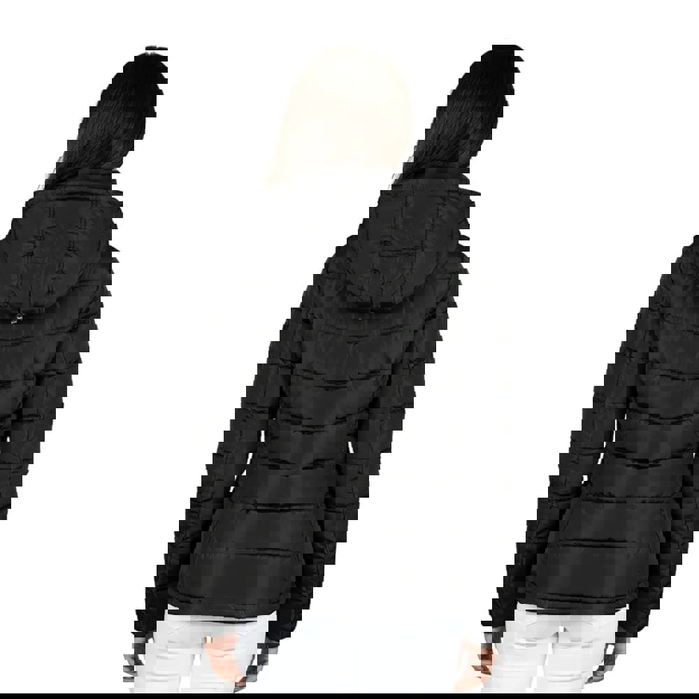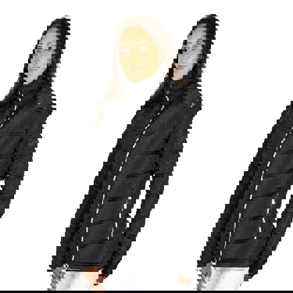 The Coldstream Melrose quilted jacket for women comes in black with a satin finish and a tailored fit. It is padded with faux duck feather down filling and uses insulating fabric technology. A standing collar is finished with a faux fur collar, while long sleeves complete the silhouette.