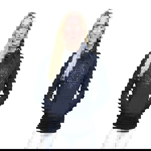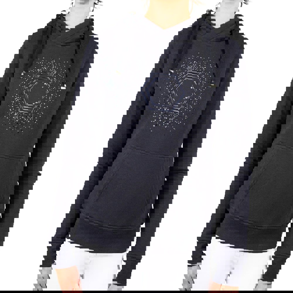 Finished in navy, it includes a kangaroo pocket at the front and detailed branding across the design. Diamante and embroidered elements sit alongside a hexagon logo motif for a distinctive finish.