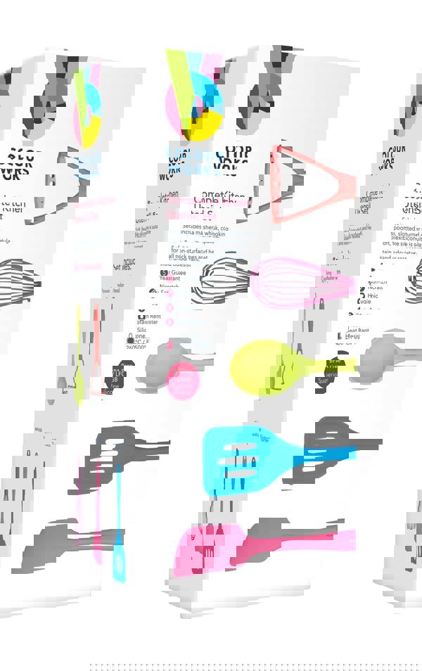 Colour your cooking with a set of smart kitchen utensils that are bright in every way. The Colourworks silicone cooking utensils set includes all the essential tools you need to get creative in your kitchen. This five-piece set includes a red potato masher, a purple whisk, a green cooking spoon, a blue fish slice and a pink spatula. So, it’s perfect as an upgrade to tired kitchen tools, or as a first set for a new home. Each of these kitchen utensils is made of durable, LFGB grade silicone or tough nylon. This makes them soft, gentle and safe to use on non-stick cookware. Silicone's heat, stain and odour-resistant too, which means they're a breeze to clean.