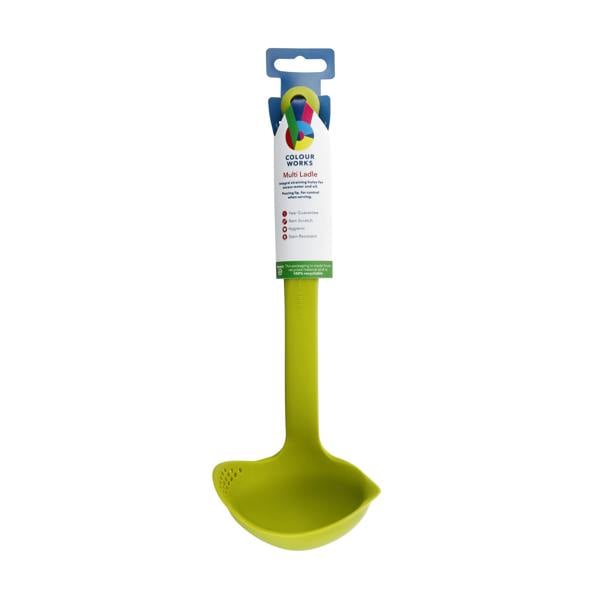 You asked for it. Colourworks' one-piece silicone kitchen ladle is back, and it's full of bright ideas. Of course, it's still deliciously colourful, and perfect for stirring soups and scooping casseroles. But that's just the start. Colourworks has improved this ladle with holes for draining and a built-in pouring spout. Simply swish it to the right to strain off excess water or oil (great for eggs). Or tip it to the left to pour perfect portions of your favourite sauces. Like all of Colourworks' one-piece silicone tools, it's reassuringly robust. It has a firm nylon core coated with hygienic, LFGB-grade silicone. The silicone is soft yet strong, and heat resistant too. This makes it ideal for stirring in non-stick cookware (it won't leave a scratch). Time to clean up? It's stain and odour resistant for easy cleaning and can be washed easily in the dishwasher or by hand. Pair it with other Apple Green tools, or explore the Colourworks palette with tasty Plum Purple, Cherry Red and Blueberry utensils. This heat-resistant ladle is 100% BPA free. The comfort-shaped, textured handle has a hanging loop for easy storage.