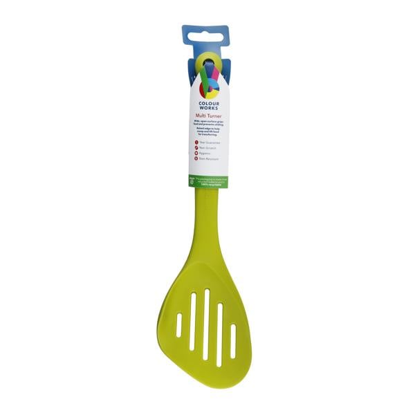 It's time to take a stand against broken yolks, half-flipped pancakes and crumbled cookies. Grab this colourful silicone turner and you'll be able to handle those delicate foods with the firm-but-fair attitude they need. It's all down to the clever construction - a tough metal core coated with soft, LFGB-grade silicone. It's flexible, so it will glide gently under fragile fried eggs, and it's sturdy, so it's great for lifting heavy burgers or scraping stubborn steaks from the pan. Colourworks has even added a clever new feature - a raised lip on one edge, which helps to keep ingredients in place as you serve up. Proud owner of some cutting-edge non-stick cookware? This heat-resistant turner can handle temperatures up to 260°C (500°F) and is gentle on non-stick coatings, so it's perfect for lifting straight from the pan. Time to clean up? This silicone spatula turner is stain and odour resistant, and easy to clean in the dishwasher or by hand. Of course, because it's Colourworks, your kitchen will feel a little brighter too. It's part of Colourworks' range of reinvented one-piece silicone utensils, available in four coordinate-able, mix-and-matchable shades: Cherry Red, Apple Green, Blueberry Blue and Plum Purple. Complete with a comfortable, textured handle, this flexible turner is 100% BPA free.