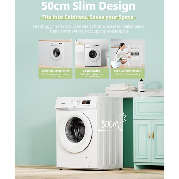 Ultra-thin design, the Comfee washing machine is only 48(S) / 50(M) cm deep, suitable for various living environments, such as under kitchen cabinets, bathroom corners or narrow corridors.