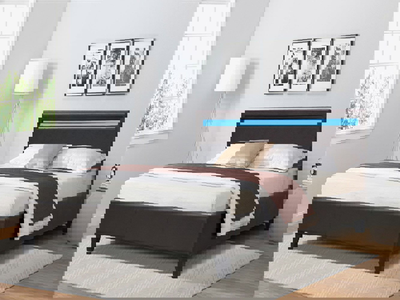 The Faux Leather Bedframe offers both style and function with its LED strip feature, providing a sleek and modern touch to any bedroom