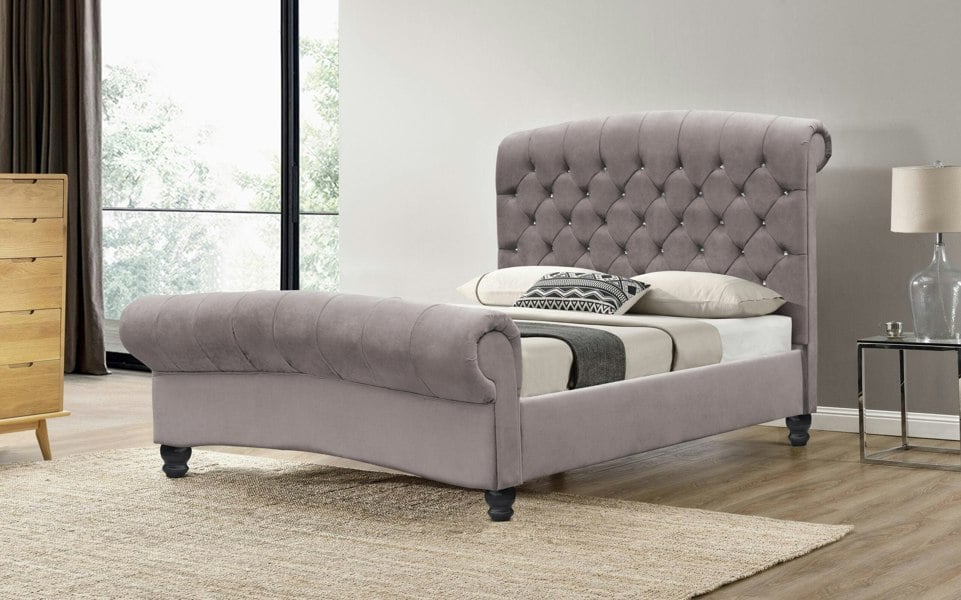Transform your bedroom into a luxurious oasis with our Cannes Plush Velvet Diamante Chesterfield Sleigh Bed.