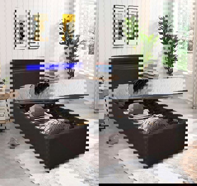 This versatile design offers hidden storage with a convenient gas lift mechanism and a stylish LED strip