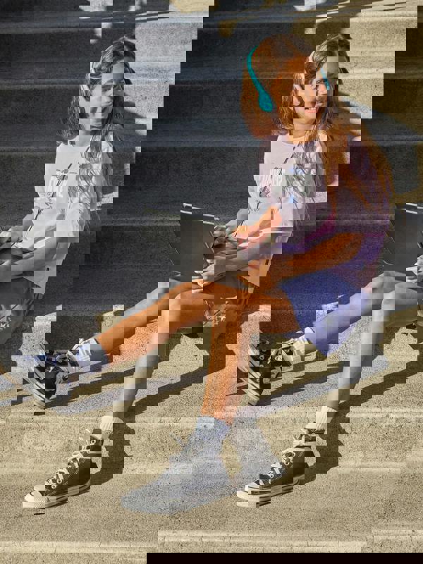 These Converse girls’ shorts combine a high-rise shape with practical details for everyday wear. Made from lightweight Dri-Fit “Sport Essentials” jersey, they include drapey side-panel pockets with shirring at the pocket openings. A dissected CTP heat transfer sits at the wearer’s left pocket for a branded finish.