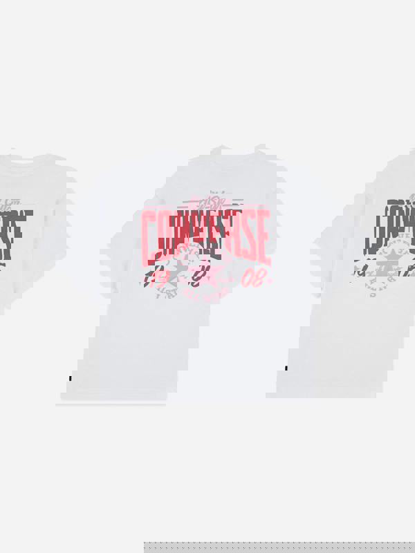 This Converse boxy T-shirt comes in white with a multi hit GFX design. The shape includes a dropped shoulder and short sleeves, finished with a round neck and straight hem. A strip wordmark flag label sits at the left side seam for a branded detail.
