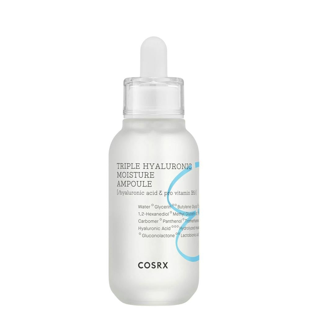 The COSRX Hydrium Triple Hyaluronic Moisture Ampoule is a viscous moisturising serum that leaves dry or dehydrated skin supple and moisturised. Vitamin B5 (d-panthenol) hydrates and acts as an anti-inflammatory agent, while hyaluronic acid locks in moisture and helps re-plump the skin.