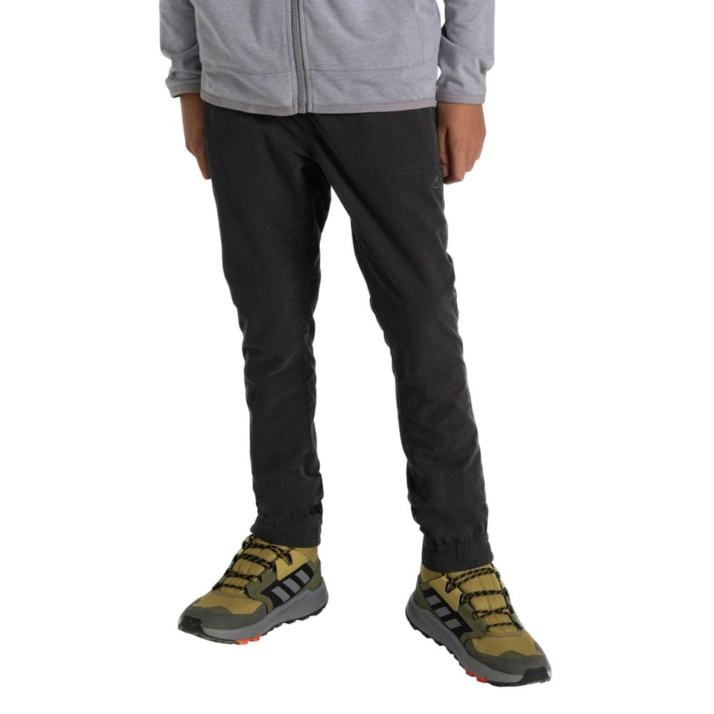 Craghoppers Pinzon Nosilife trousers for children in Black Pepper, made from 100% recycled polyamide with a 100% polyester lining. The mesh fabric keeps the look clean and simple, finished with a plain design and logo detail. A regular fit and elasticated waistband provide an easy pull-on style, while elasticated cuffs create a secure finish at the ankle.