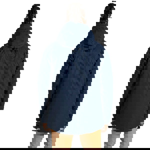 Craghoppers Breckon waterproof jacket in blue navy, made from 100% recycled polyester with a TPU lining. The plain design is finished with a textured surface and includes text detailing. A hooded neckline and long sleeves create a practical outer layer, supported by an adjustable, lined, sew-on hood and an adjustable hem.
