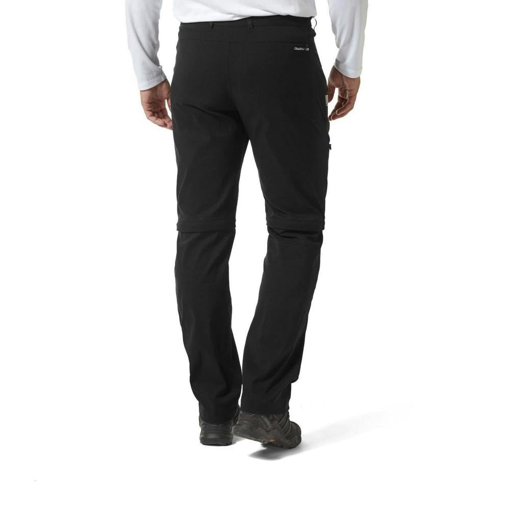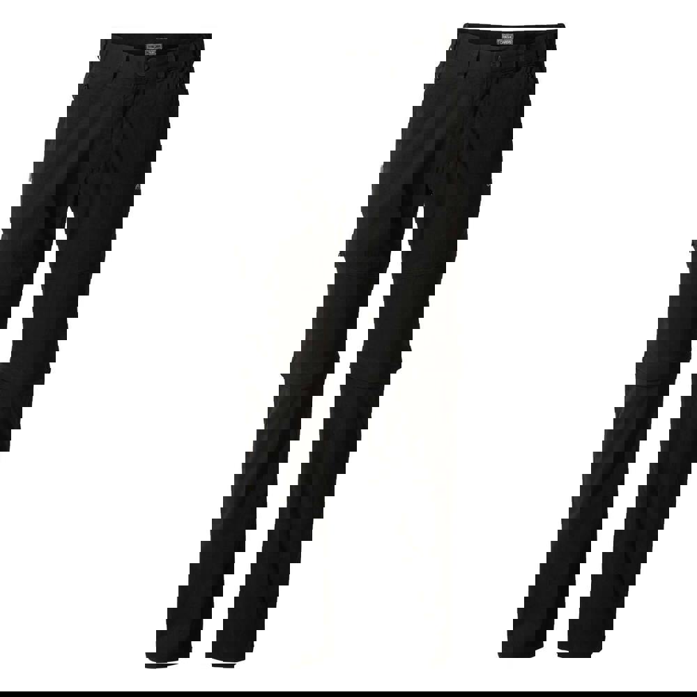 Craghoppers Kiwi Pro II Convertible Trousers are men’s trousers with a plain black finish and zip-off legs for a convertible setup. Made from 96% polyamide and 4% elastane, they combine stretch with SmartDry Eco and non-iron fabric technology. A part-elasticated waistline provides a flexible fit, while four zip pockets keep essentials secured. Practical details include heel tape and a built-in sunglasses wipe, with recycled materials used in the construction.