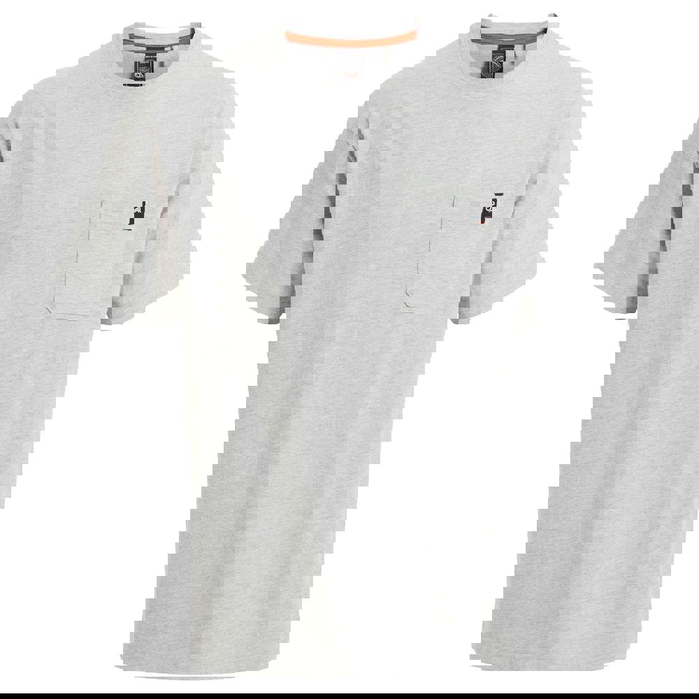 Craghoppers Wakefield workwear pocket T-shirt in soft grey marl. Made from a jersey fabric with 90% organic cotton and 10% viscose, it has a crew neck and short sleeves for a clean, casual finish. A single chest pocket adds a practical detail, while the logo and back print complete the design.