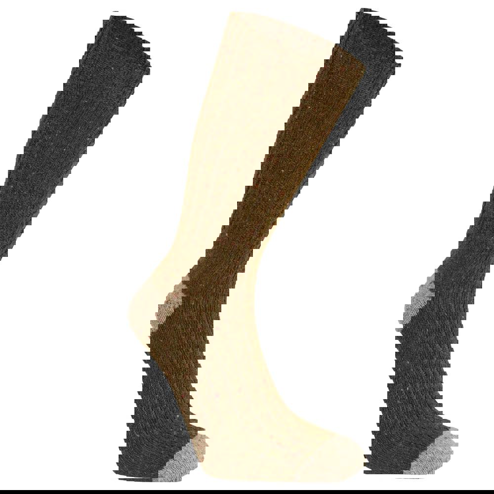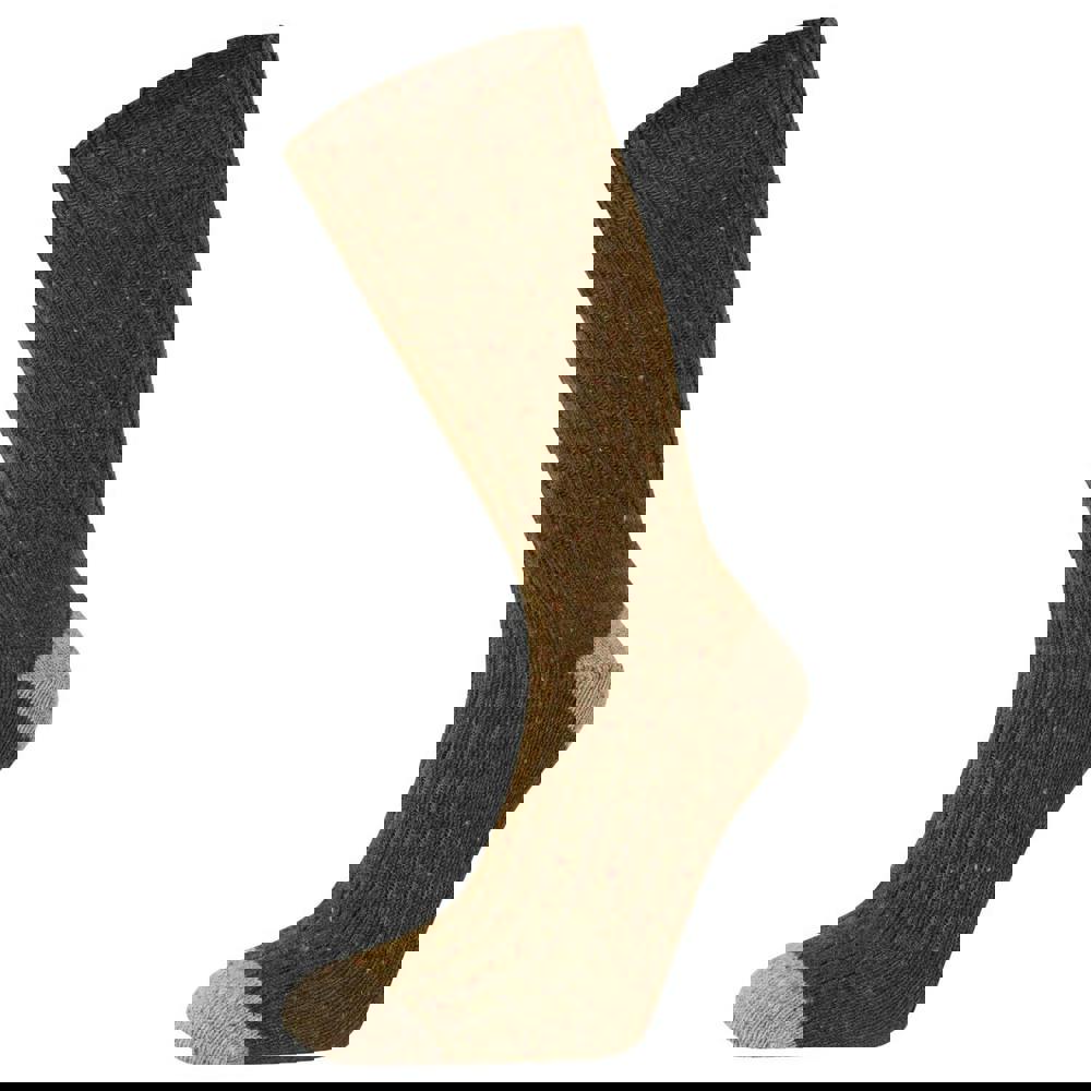 Craghoppers Torver walking socks come in a dark moss and beige colourway with a speckle design. The fabric blend combines 53% wool, 38% acrylic, 8% polyamide and 1% elastane. Built for walking, they include arch support and ventilated sections, with contrast detailing at the heel and toe.