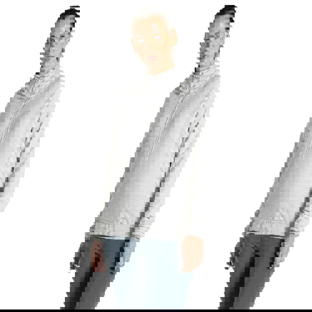 This women’s half zip fleece top comes in Lunar Grey with a plain melange finish and logo detail. It has a hooded neckline with a sew-on hood and toggle adjuster, plus long sleeves with elasticated cuffs. A fitted hem helps keep the shape neat, while the pull over style and half zip fastening offer simple, practical wear.