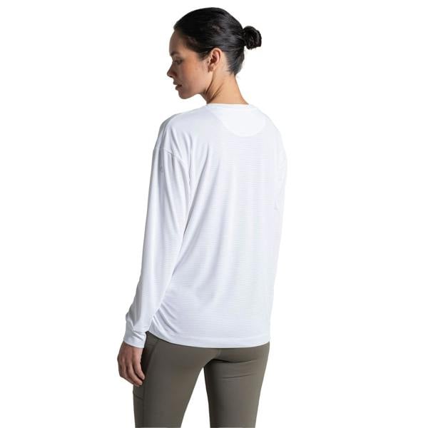 Built for active days, the Craghoppers Women’s Nosilife Long-Sleeved T-Shirt pairs a clean white finish with a patterned logo design. Cut in a regular fit with a classic crew neck and long sleeves, it offers a straightforward silhouette that works well for travel and everyday wear.