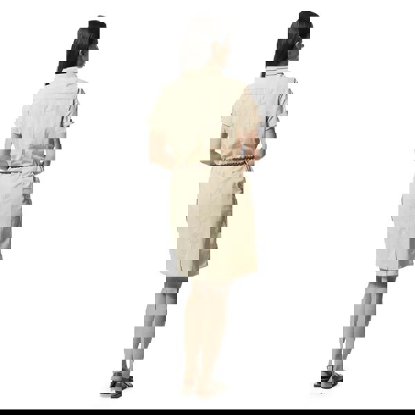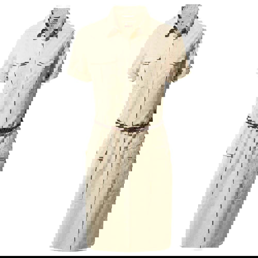 Craghoppers NosiLife Savannah shirt dress is cut in 100% polyamide ottoman fabric in Desert Sand. The button-through front and belted waist create a defined silhouette, finished with a neat collar for a clean, shirt-inspired look. Practical detailing includes patched-on bellowed pockets, giving the dress a functional feel for warm-weather wear.