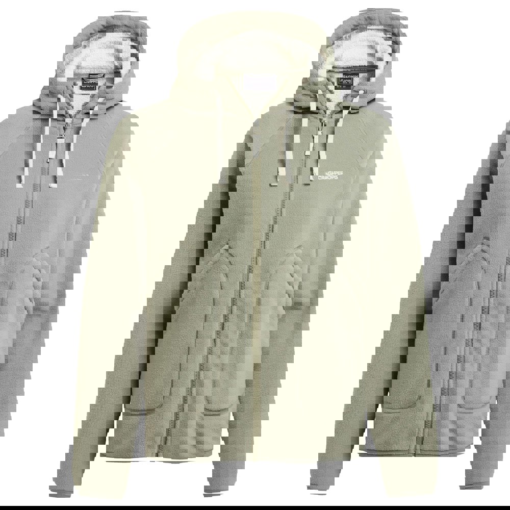 This full zip fleece jacket is made from 100% recycled polyester, with a bonded fleece outer and a deep pile sherpa fleece lining. The design is plain with a logo detail, finished with a hooded neckline and a standing collar for added coverage.