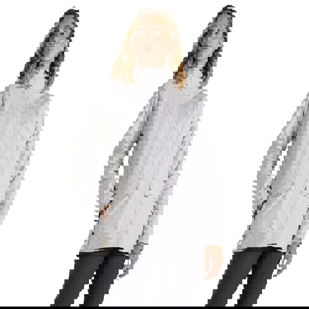 This women’s Kaia waterproof jacket comes in Lunar Grey with a plain design and a hooded neckline with a standing collar. Made from polyester and recycled polyester, it uses mesh and taffeta with a TPU membrane and includes Aqua Dry and H2OShield technology. The jacket is lightweight, breathable, waterproof and wind resistant, with a DWR finish and a PFC-free construction.