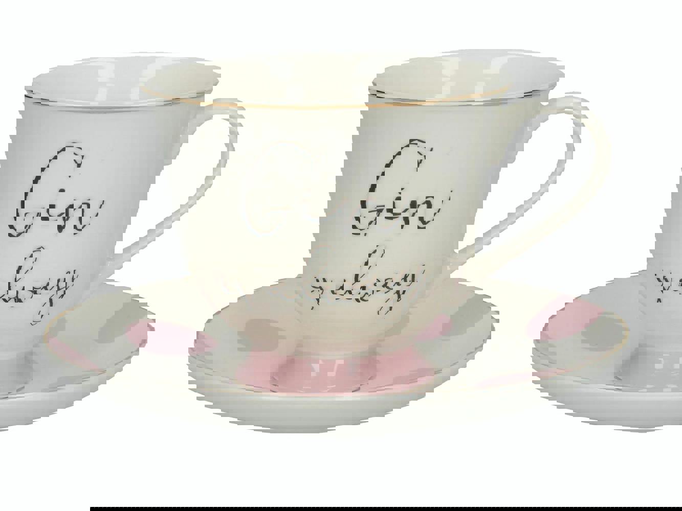 This teacup and saucer set is from the Ava & I collection, perfectly balancing feminine prettiness with modern style and a dash of sass. The saucer is spotted with pretty pastel pink polka dots, while the teacup has a matching pink foot. Each piece is framed with a fine gold rim and a playful "Gin is always a good idea" slogan continues across both pieces. Made of fine china and delicately shaped, this is a sophisticated way to enjoy a cheeky gin and tonic at the end of the week! The set is presented in a luxury hat box to complete this stylish gift. Cup capacity: 200ml.