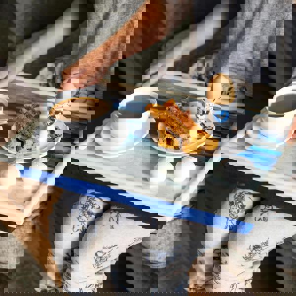 Sit back and settle down to enjoy dinner in front of the TV, putting together a jigsaw puzzle, or sketching your latest masterpiece. The Creative Tops 'Blue Abstract' Cushioned Bean Bag Lap Tray provides the perfect stable base for these activities. Backed by a soft blue bean bag, this cushioned tray moulds to the shape of your legs. This allows it to rest steadily and comfortably on your lap, so there's less chance of your plate, pad or even your laptop sliding around on its surface. It's not just practical though. This large dinner tray's decorated with an abstract art print, showing swathes of sandy beaches fading into almost endless oceanic views. Framed by a gorgeous white border, it makes a great addition to any kitchen or dining table - even when it's not in use.