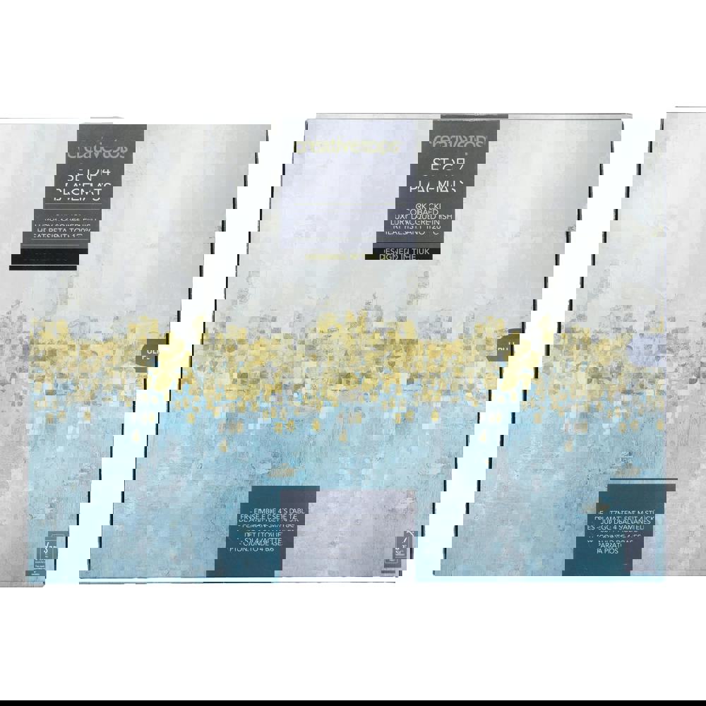 Dinnertime will quickly become the most sparkly time of the day, with these placemats on hand. Soft shades of teal and cream are divided by a scattering of golden specs in this ‘Golden Reflections’ inspired placemat design, which echoes moments of natural beauty, like a summer sunset over the sea. The rectangular shape is topped with a luxury, lacquered surface that’s wonderfully smooth to touch. It’s stain resistant, easy to wipe clean and will work hard to protect your surfaces. At 0. 5 cm thick and backed with cork, the mats will keep hot dishes away from your tabletop with a heat-resistance of up to 120°C. To seal the deal, the edges of the mats are lacquered too, so they’re durable and resistant spills and moisture from wet plates and dishes.