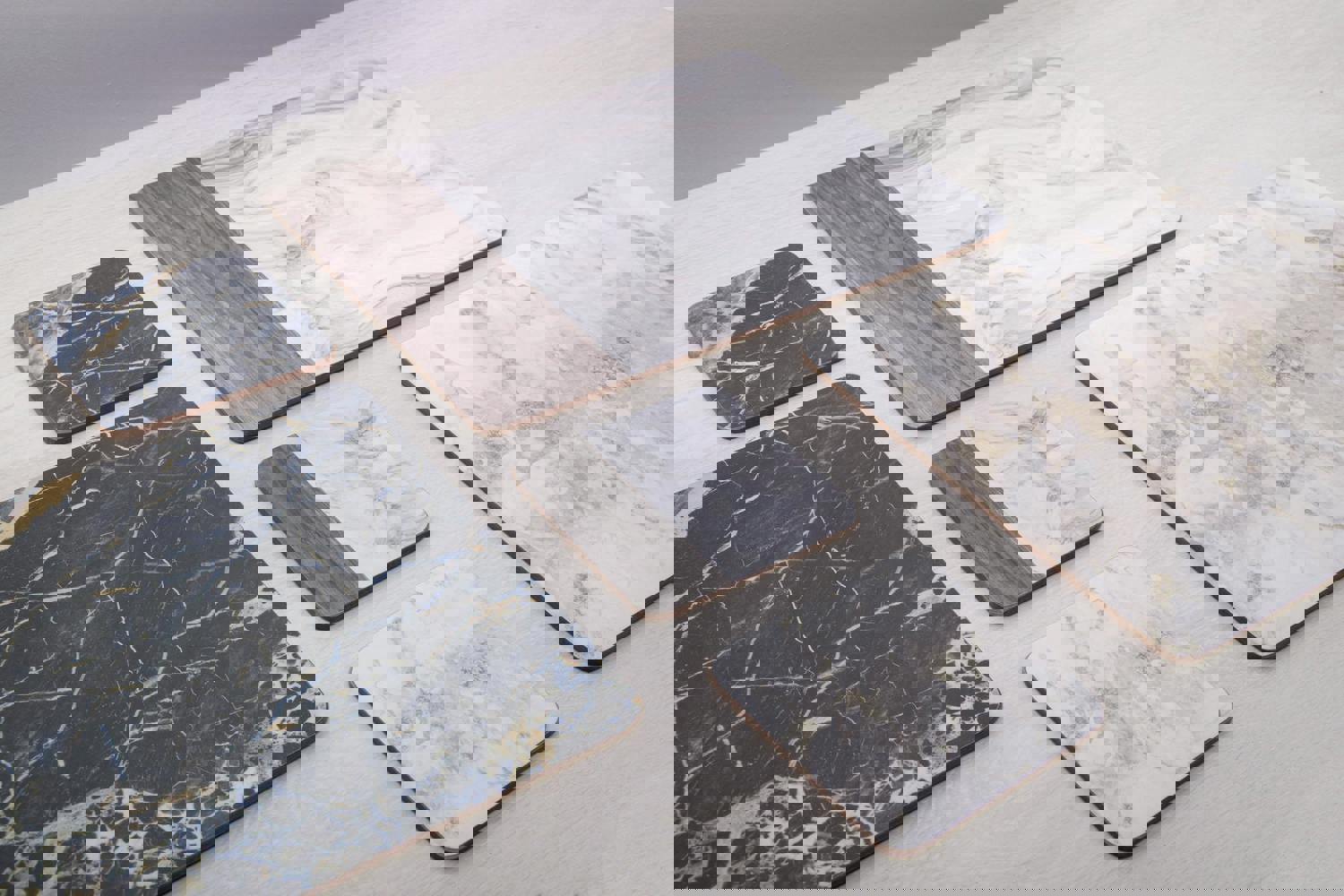 Dinnertime will quickly become the most stylish time of the day with these placemats on hand. They're decorated with a white marble print. Decadent swirls of white and grey give them a stunning look, while rich, grey wood panels create a striking contrast. Each white marble-style placement is topped by a luxury, lacquered surface that's wonderfully smooth to touch. It's stain-resistant, easy to wipe clean and works hard to protect your surfaces. They're also backed by a 5 mm (¼ inch) cork layer, which protects against temperatures up to 120°C (250°F).
