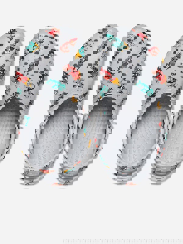 Crocs Boys Classic Race Cars Graphic Clog in grey adds a bold graphic finish to a classic clog shape. The design includes a race car print and comes in a versatile grey colourway.