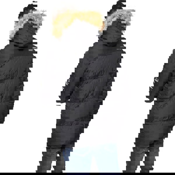 This hooded jacket keeps the look clean with a plain finish and logo detailing. It has long sleeves and a pullover construction, secured with press stud fastening. Storage is practical and clearly defined, with two front pockets and an additional sleeve pocket with a zip closure.