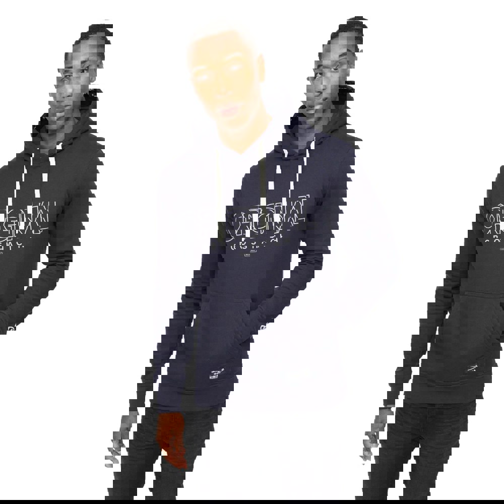 Branding comes through a logo and text design, supported by a woven label. A single kangaroo pocket completes the front, keeping the look classic and practical for everyday wear.