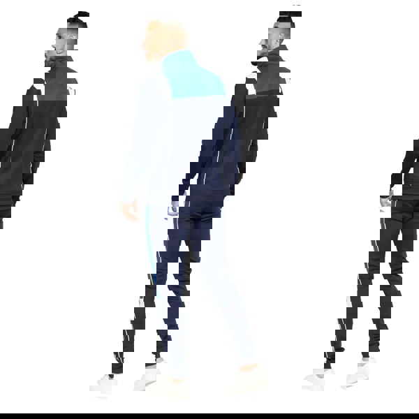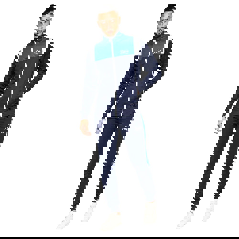 This two-piece tracksuit set includes one top and one pair of bottoms, made from 100% polyester tricot fabric. The top has long sleeves with ribbed cuffs and a standing collar, finished with a full zip fastening. Design details include contrast panels, printed elements, a rubberised logo, cut and sew panelling, and piping detail.