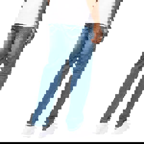Crosshatch Detendu jeans in a mid wash, cut to a relaxed fit. The design includes a logo and badge detail, with a classic five-pocket layout for everyday wear. Finished with belt loops and a button fastening with a zip fly.