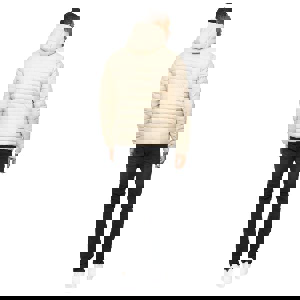 Crosshatch Gattering MVE jacket in stone with a padded, quilted finish. The design includes a logo patch and a hooded neckline, paired with long sleeves and elasticated cuffs for a clean outline. A full zip fastening runs through the front, with zipped pockets for secure storage.